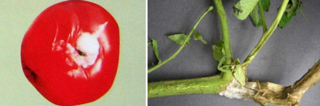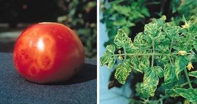 ניתן לראות סימפטומים של המחלה על עלים של עגבנייה ופירותיה: