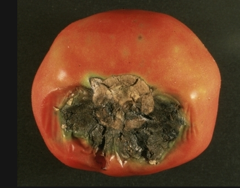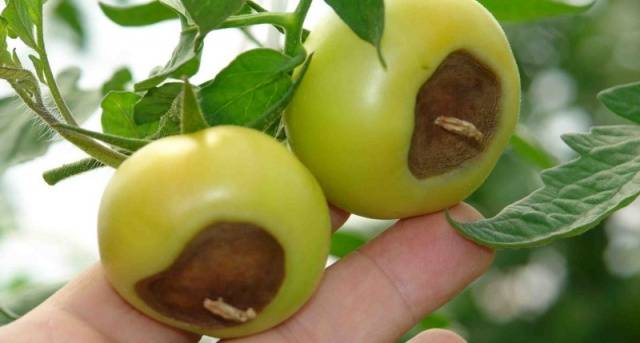 סימן למחלה הוא הופעת כתם מעוגל חום על גבי הפרי. רקמות הירק מתחת לעור הכהה מתחילות להירקב, עם הזמן האזור הפגוע הופך רך. בנגיעה הקלה ביותר, העגבניות הללו יכולות לנשור.