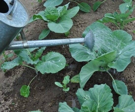לאחר שהכרוב השתרש, יש להשקות אותו באופן קבוע, לשחרר את האדמה, להסירו עשבים שוטים ולהאכיל. בהתחלה, 2 ליטר זה מספיק, ואז כשהוא גדל, כמות המים גדלה ל 10. יש לזכור כי השקיה בשפע מובילה למוות של שורשים ומחלות פטרייתיות.