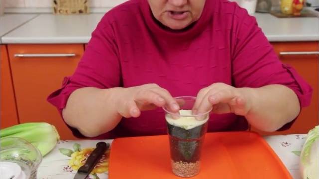 ואז מלאו את המיכל בצורת חרוט שהוכן במים כשליש והניחו את החלק התחתון של ראש הכרוב עם הקרקעית בתוכו. יש לטבול במים רק את תחתית הגדם.