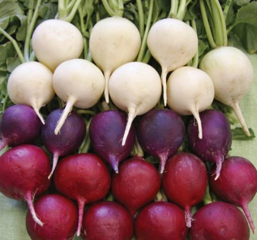צנון סגול - הכלאה מוקדמת שמבשילה תוך 65 יום. ריכוז החומרים המזינים זהה להרכב הצמרות המשמשות להכנת סלטים. זן שנתי, באזורים הדרומיים ניתן לקצור שני יבולים במהלך הקיץ. יבול שורש סגול כהה עם שברי בז '. הקליפה לא אחידה, מחוספסת. הצורה היא בצורת חרוט, משקל 200 גרם. עיסה לבנה עם כתמים סגולים, עסיסית, מתוקה, ללא מרירות.