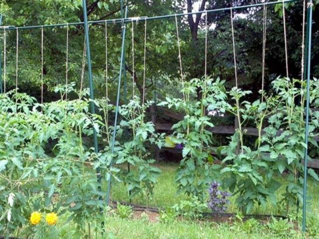 כל עגבנייה קשורה בחבל לסורג. עם התפתחות העגבנייה הגבוהה, הגזע נקשר בחבל. במהלך תקופת הגידול, יש לקשור את העגבניות בזהירות (כמו בתמונה) כדי שהגבעולים יתפתחו כראוי ולא ייפלו.