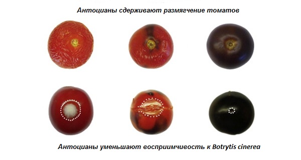 התוכן הגבוה של אנתוציאנינים בעגבניות הושג על ידי בחירה ארוכת טווח במטרה לשפר את תכונותיהם האנטי-אוקסידנטיות כדי להגביר את יכולת ההגנה מפני רדיקלים חופשיים. זה עוזר להתפתחות סרטן, בעיות לב וכלי דם, דמנציה סנילית.