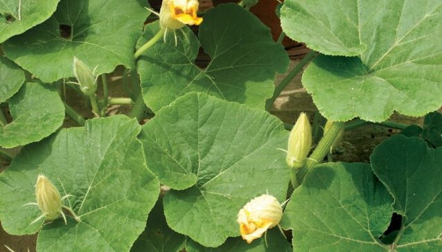 פרחי דלעת צהובים גדולים מחוברים לגבעולים ארוכים. הצבע הבהיר והארומה מושכים דבורים וחרקים, המעורבים בתהליך האבקה.