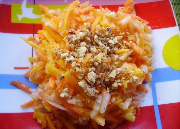 מגרדים ירקות גס, מתבלים בתערובת של מיץ לימון ושמן צמחי. מפזרים שמיר קצוץ דק ומתבלים במלח. לערבב הכל.