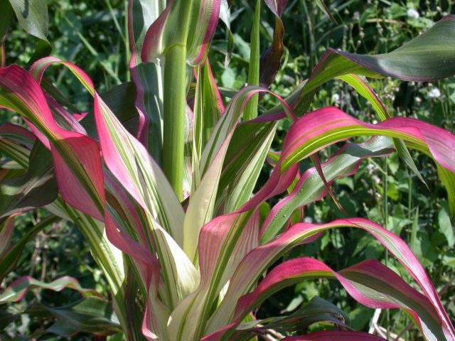 גבעולי זן התירס תות נדיר לגדול מעל 1 מ 'עם הזנה בשפע, השקיה ותאורה מספקת, צמיחתם של צמחים בוגרים יכולה להגיע ל -1.5 מ'. עלים ירוקים בהירים דקים, עם פסים לבנים לאורך, הם דקורטיביים מאוד ומעניקים לנטיעות אקזוטי. תראה.