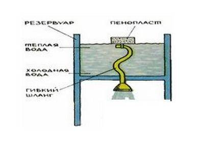 בתוך מיכל האגירה יש להכין מכשיר פשוט המאפשר כניסה של מים חמים בלבד למזלף. מבחינת מצבו הפיזי, הוא תמיד למעלה, ולכן מצוף עשוי קצף. פיסת צינור גמיש המחוברת למזלף מחוברת אליו.