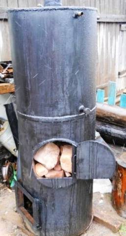 מיכל האחסון מוכן, עכשיו אנחנו צריכים להכין תא אש. בצילינדר השני עם קצה מנותק נחתכת דלת להעמסת עצי הסקה, ובתחתית יש מפוח. Grizzlies מרותכים בפנים, אבל אתה יכול לעשות אותם נשלפים. על תיבת האש המוגמרת מותקן התקן אחסון מרותך עם שקע ארובה ארוך, ולאחר מכן מולחנים שני הגלילים יחד. התוצאה היא חבית ארוכה, המחולקת באמצע על ידי הקרקעית לאח אש ומיכל אחסון. כעת נותר לחבר את אספקת המים להתאמה התחתונה של המיכל, ומהיציאה העליונה לגרום לצינור להתנקז למיכל שעל תא המקלחת. אם תרצה, ניתן להשמיט את המיכל, וניתן להשלים מיד את היציאה העליונה של צינור המים החמים בעזרת מזלף.