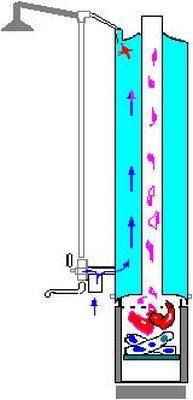 בצילינדר אטום חותכים בקצות הארובה חור ומוחדר פנימה צינור מתכת שמעביר אותו דרך המיכל. הצינור נצרב לאורך קצוות הגליל כך שמצד אחד הוא סומק, ומצד שני הוא בולט כ -1 מ '. אורך בליטת הארובה נבחר בנפרד בהתאם לגובה תא המקלחון. מחלקו התחתון של הגליל מרותך אבזר לאספקת מים קרים בלחץ, ומעליו מרותך אביזר ליציאת מים חמים.
