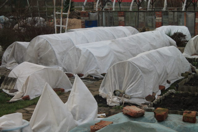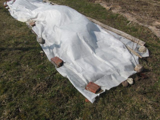 בתחילת נובמבר מתבצעת חיפוי אדמה, קידוח ודישון. אתה יכול לכסות את הצמח מבלי להשתמש במסגרת עץ באמצעות עלווה, מחטים וסרט נושם.