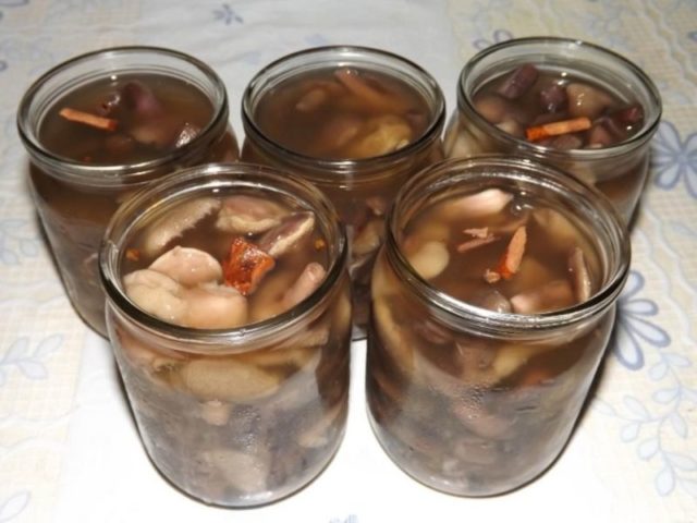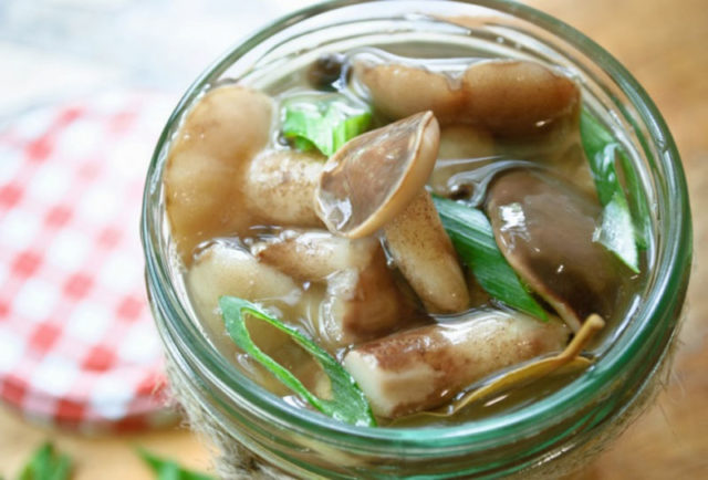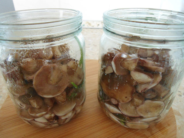 - כובעים ורגליים מבושלות, אותם יש לכבוש ללא עיקור, נחתכים ומונחים במים רותחים עם מלח, פלפל, סוכר, חומץ, ומבושלים במשך 15 דקות.