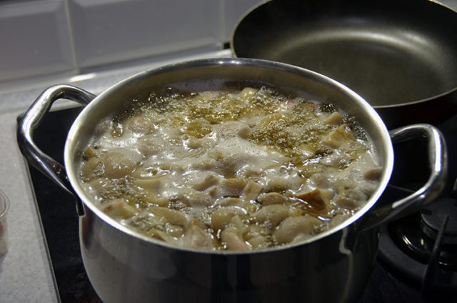 - מחצית מהמלח מונח ב 600 מ"ל מים, הפטריות מבושלות בנוזל במשך חצי שעה.